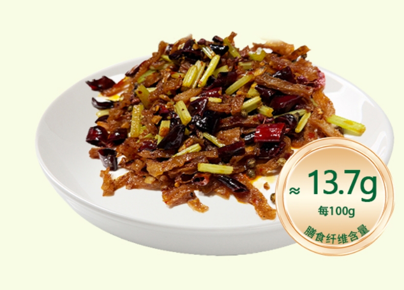 每100g膳食纖維含量在13.7g脫水后嚼勁十足,可泡發(fā)烹飪或直接調(diào)味食用,耐儲存,追劇、代餐小零嘴